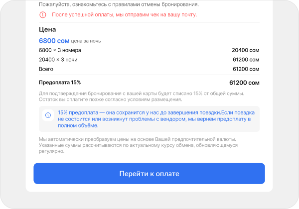 Оплатите 15% от стоимости — сумма хранится у iZDE до завершения поездки. В случае отмены или проблем с владельцем предоплата возвращается полностью.