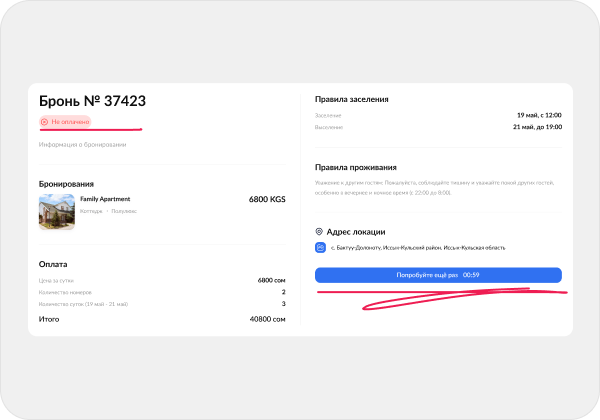 Из-за ошибки или потери соединения оплата может прерваться. Бронь сохраняется в разделе «Мои брони» ещё 15 минут, где вы можете повторно оплатить или отменить её.